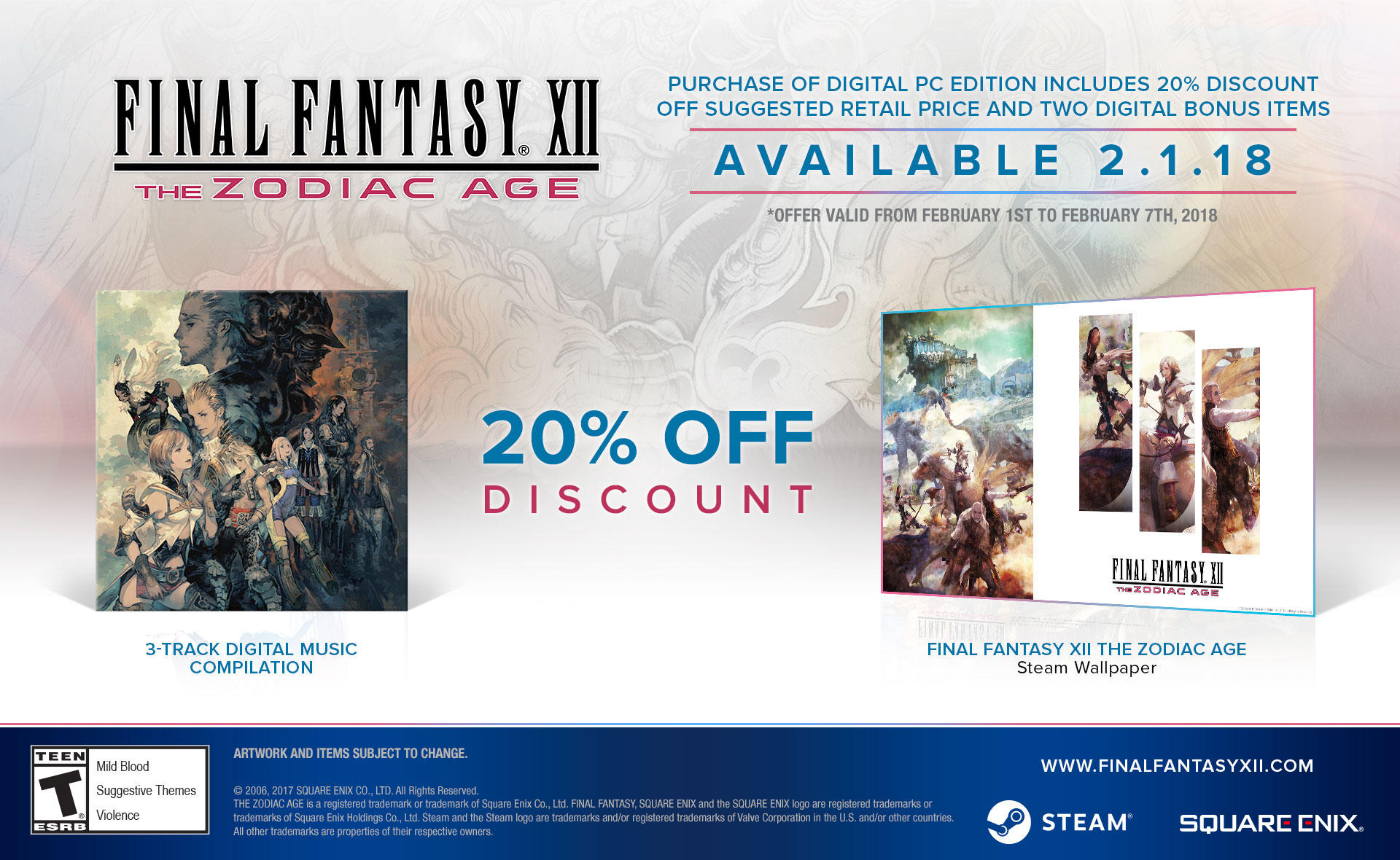 radiant Posted January 11, 2018 Author Share Posted January 11, 2018 Es dürfen bald auch PC-ler nach Ivalice reisen Zitat Final Fantasy XII: The Zodiac Age Coming to PC via Steam on February 1 Download HQ Trailer .MP4 | 307 MB - New Key Visual Final Fantasy XII: The Zodiac Age Arrives for PC on February 1 Following the resounding success of over a million units of Final Fantasy XII: The Zodiac Age shipped last year for the PlayStation 4 computer entertainment system, Square Enix announced that players can visit the wondrous world of Ivalice on PC beginning February 1. Final Fantasy XII: The Zodiac Age on Steam will release with all of the modern advancements and features available in the PlayStation 4 version, such as latest-generation visuals, a remastered soundtrack, new Speed and Trial modes, fast forward function, and many other enhanced features. The following new features will also be added for PC users: • 60fps - Ivalice will look better than ever with the game running at 60fps • Compatible with 21:9 ultra-wide monitors - Up to three HD monitors can be used for a potential 48(16x3):9 experience. • New Game Plus and New Game Minus - Post-game content modes are now accessible from the beginning of the game. • Three background music options – The original, re-orchestrated and soundtrack versions are now available from the beginning of the game. • Maximized License Points and Gil - New functionality added to grant players max License Points and Gil from the configuration screen. • Full controller support, Steam Trading Cards and more to optimize the PC player experience. Fans can learn more about the new features the PC version has to offer during special launch program on Thursday, February 2nd at 12:00 a.m. Pacific, where Producer Hiroaki Kato and Director Takashi Katano will answer questions presented by FFinal Fantasy fans on Twitter. Square Enix has also unveiled a brand-new Collector’s Edition for the game, available now for pre-order exclusively from the Square Enix Online Store for $149.99. The Collector’s Edition features an official Collector’s Edition Steelbook™ with the original soundtrack, a five-piece Judge Masters Bust Set, six-card art set and a digital download code for the game. Fans that purchase the game through Steam within the first week of launch will also receive a 20% discount, a three-track digital music compilation and a new Steam Skin illustrated by famed Final Fantasy artist Isamu Kamikokuryo. Final Fantasy XII: The Zodiac Age will be available on Steam for $49.99. Wunderbare Sache Quote Link to comment Share on other sites More sharing options...